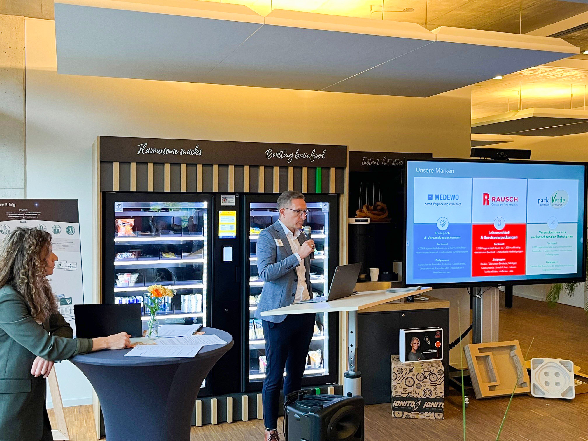 Nach der Begrüßung durch Wirtschaftsreferent Dr. Wolfgang Hübschle gaben Sabrina Zeiss und Dennis Gußen spannende Einblicke in die MEDEWO Gruppe. Mit den Marken MEDEWO, Rausch Packaging und packVerde zählt das Unternehmen zu den führenden B2B-Versandhändlern für Verpackungslösungen in der DACH-Region. Seit der Übernahme von RAUSCH Packaging 2010 ist MEDEWO in Augsburg präsent, seit 2019 ergänzt durch das nachhaltige Start-up packVerde.