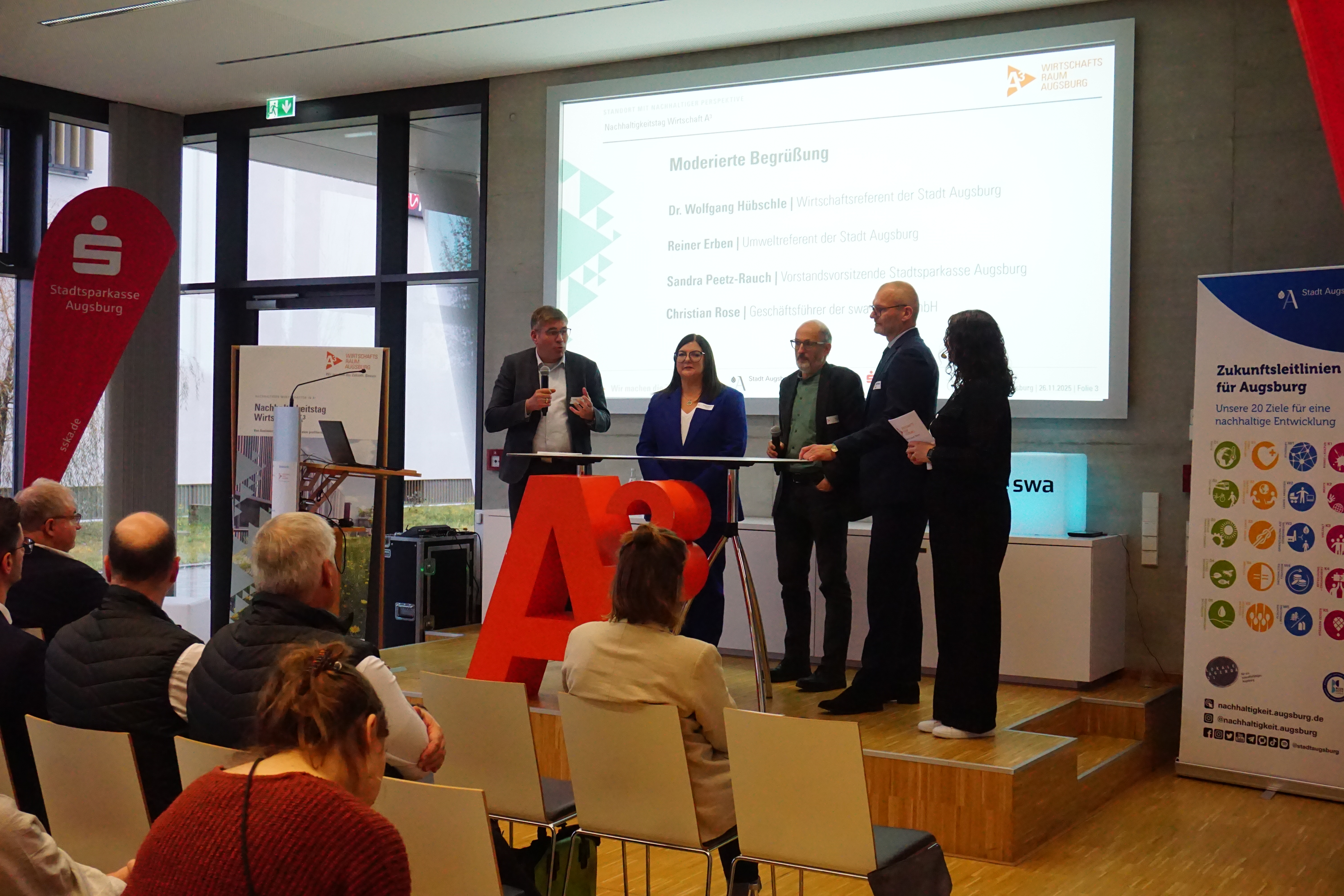 Wie bleibt die Wirtschaft zukunftsfähig? Mit gemeinsamen Projekten – davon überzeugte der Nachhaltigkeitstag Wirtschaft A³, das Highlight der Wochen der Nachhaltigkeit, in diesem Jahr im Technologiezentrum Augsburg. Seit 2017 organisiert die Regio Augsburg Wirtschaft GmbH das Format zusammen mit dem Büro für Nachhaltigkeit und uns, unterstützt von Stadtwerken Augsburg und Stadtsparkasse Augsburg. Das Event hat sich zur zentralen Plattform für nachhaltiges Unternehmertum entwickelt und bringt jährlich Wirtschaftsvertretungen und Experten zusammen.